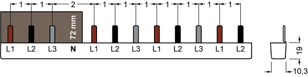 Specjalne wykonania szyn łączeniowych przygotowano również do łączenia wyłączników różnicowoprądowych z wyłącznikami nadmiarowoprądowymi. Są to wykonania szyn pozwalające połączyć 3-fazowy wyłącznik różnicowoprądowy (w wykonaniu z biegunem N zarówno po lewej jak i po prawej stronie) z ośmioma aparatami 1-modułowymi. Układ tych szyn przedstawiono na rysunkach nr. 3 i 4.