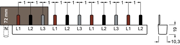 Rys. 5. Układ szyny łączeniowej 5ST3624 do wyłączników nadmiarowoprądowych z biegunem N po prawej stronie.