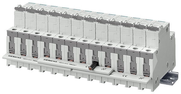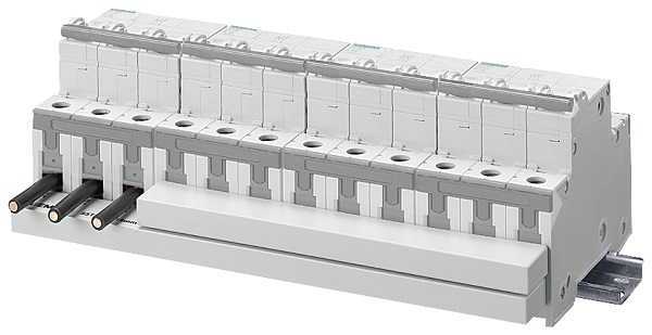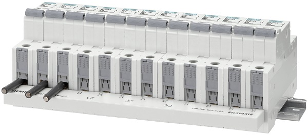 - możliwość łączenia za pomocą szyn aparatów o biegunowości 1+N, zabudowanych w obudowie o szerokości jednego modułu montażowego. Mowa tutaj o wyłącznikach nadmiarowopradowych 5SL60 oraz wyłącznikach kombinowanych RCBO 5SV1.