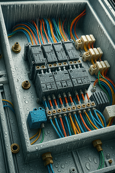 Urządzenia elektryczne są projektowane do pracy w kontrolowanych warunkach. Nadmierna wilgotność w obudowie może prowadzić do korozji elementów metalowych, gdyż krople wody powodują rdzewienie zacisków, przewodów i złączy. Korozja obniża przewodność, osłabia połączenia i skraca żywotność komponentów.