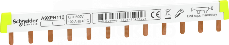 Szyna sztyftowa A9XPH112 100A 1-biegunowa (jednobiegunowa), o numerze A9XPH112, 12 modułów do łączenia aparatury modułowej Acti9. Prąd obciążenia 100 A, kolorystyka biało-żółta: dopasowana do aparatury Acti9, ze wskazaniem na duże znaczenie osłon bocznych i zaślepek szyn w zakresie bezpieczeństwa