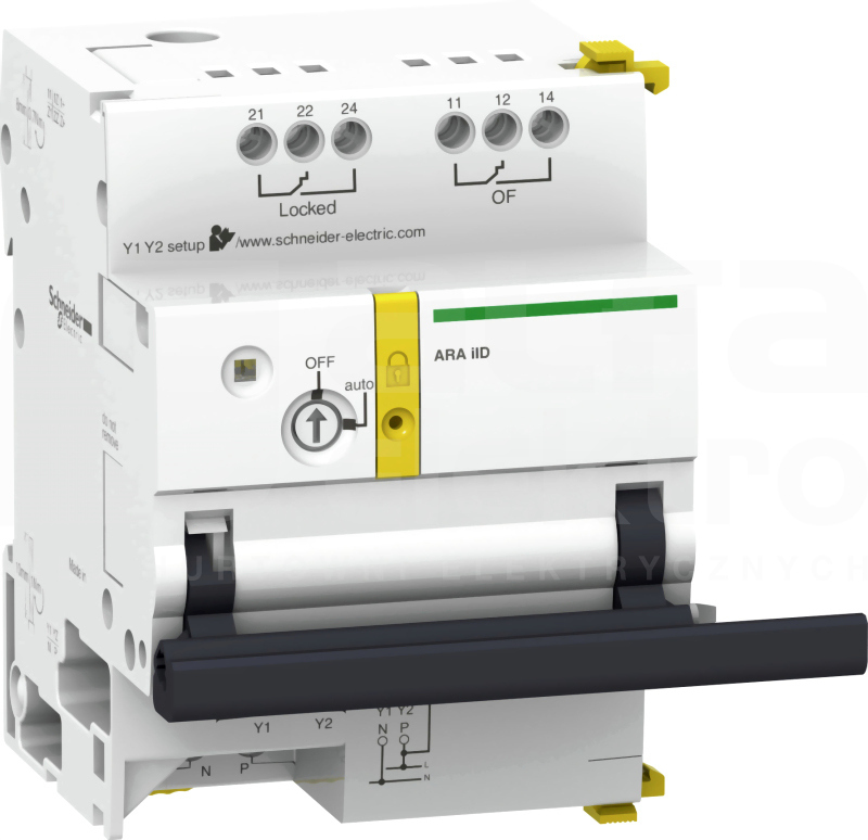 This Acti 9 ARA iID automatic recloser auxiliary is dedicated to iID residual current circuit breakers. It performs 4 programs of automatic reclosing of the associated protection device after tripping. It increases the availability of installations without supervision, isolated, hard of access and demanding very great availability by restoring them to operation without intervention by personnel in the event of a transiant fault. The width in 9mm pitches is 7. This device controls 2P installations. The operator can choose predefined reclosing programm which allows the safety and availability of facilities to be reconciled taking into account the facility environment. The Ue rated operational voltage is 230VAC. The operating frequency is 50Hz or 60Hz. The circuit is placed in safety configuration by the padlocking device. The operating temperature is -25°C to + 60°C. The storage temperature is -40°C to + 85°C. This device is compliant with xxxx standard