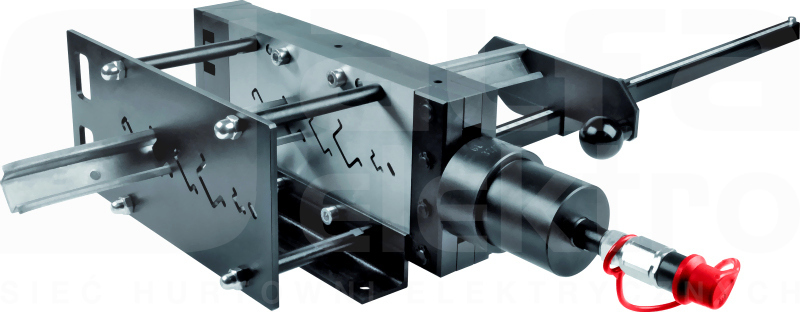 Przecinarka szyn montażowych GL 6 Przecinarka hydrauliczna do cięcia szyn montażowych oraz wycinania podłużnych i poprzecznych otworów eliptycznych: • łatwe cięcie bez deformowania i bez gratu • cięte profile wg zamówienia - tabela poniżej • wycinanie otworów (6,4 x 12,4 mm) pod śrubę M6 w szynach TS35 • szybkozłącze hydrauliczne typ PT Współpracuje z pompą hydrauliczną H 800 lub agregatem AH 500, AH 550. Masa: 17,3 kg; Nacisk: 112 kN