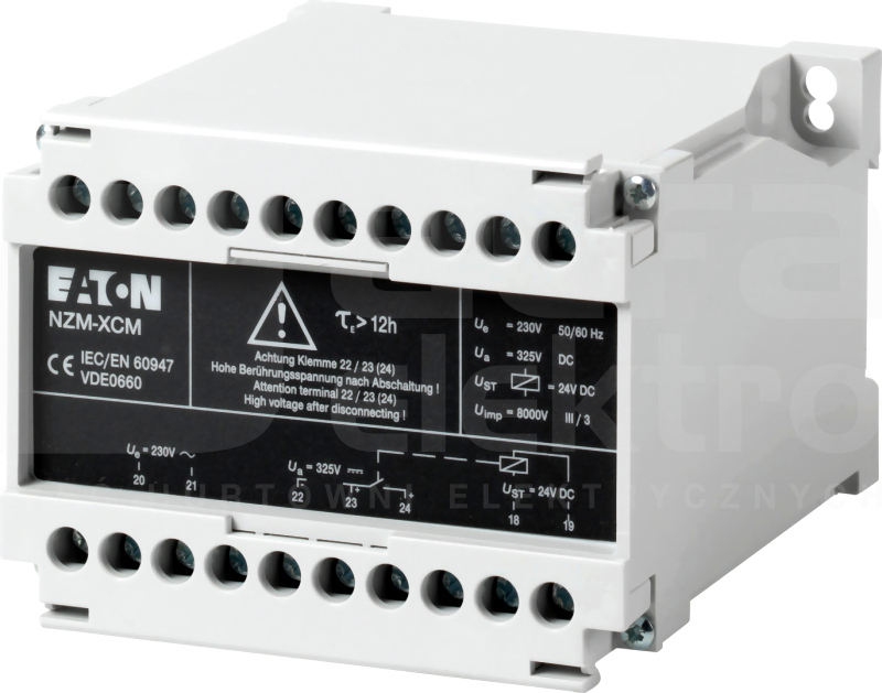 Opcjonalne akcesoria do serii wyłączników NZM obejmują szeroką ofertę urządzeń przystosowanych do użytku międzynarodowego. Montaż jest elastyczny i łatwy dzięki modułowym grupom funkcyjnym. Wskazówki: Urządzenie kondensatorowe 230V 50/60 Hz w połączeniu z wyzwalaczem prądu roboczego NZM..-XA208-250AC/DC. Obudowa: klasa ochrony IP20. Brak atestu UL/CSA. Umożliwia bezpieczne stosowanie wyłączników mocy jako przełączników sieci zamkniętych w zakresie 0-110 % Un przy stałym czasie wyłączenia 40ms. Przy braku napięcia sieciowego wbudowany kondensator przez co najmniej 12 godziny dostarcza energię potrzebną do uruchamiania wyzwalacza prądu roboczego. Rozmieszczenie urządzenia kondensatorowego odbywa się niezależnie od przełącznika. Urządzenie kondensatorowe podłączyć po stronie zasilania. Wskazówka projektowa: Normalny łącznik pomocnicze (HIN) jako zestyk zwierny łączyć szeregowo z cewką wyzwalacza prądu roboczego! W zakresie dostawy nie ma normalnego łącznika pomocniczego. Zastosowanie do: NZM1(-4), N(S)1(-4), NZM2(-4), N(S)2(-4), NZM3(-4), N(S)3(-4), NZM4(-4), N(S)4(-4)